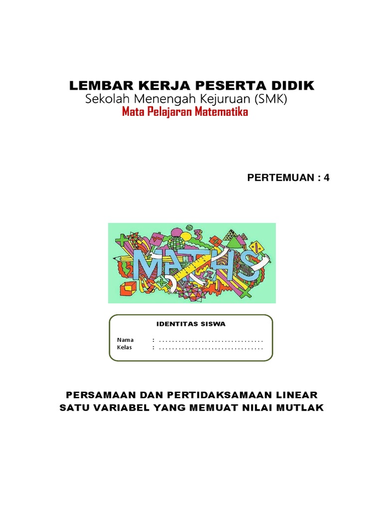 Persamaan nilai mutlak linear satu variabel. Pertidak samaan nilai mutlak adalah pertidaksamaan yang memuat tanda mutlak dan variabelnya berada didalam tanda mutlak. Namun, jenis persamaan ini berpotensi memiliki dua hasil, yang berasal dari persamaan positif dan persamaan. Lebih jelasnya perhatikan contoh soal pertidaksamaan nilai mutlak. Tentukan nilai x dari persamaan 2( x 6) 3x 2( x 6). Catatan persamaan nilai mutlak ini diharapkan dapat membantu siswa dalam mencapai kompetensi dasar mengintepretasi persamaan dan pertidaksamaan nilai mutlak dari bentuk linear satu variabel dengan persamaan dan pertidaksamaan linear aljabar lainnya atau menyelesaikan masalah yang. Berikut ini adalah beberapa bentuk umum dari persamaan dan pertidaksamaan nilai mutlak linear satu variabel Rumusbilangancom pada bab ini kita akan membahas materi mengenai sistem persamaan nilai mutlak satu variabel beserta contoh soal dan cara penyelesaiannya. Seperti lowongan kerja yang mensyaratkan pelamar dengan batas. Fungsi nilai mutlak f(x) = ax + b . Solusi penyelesaian sistem pertidaksamaan nilai mutlak adalah dengan mengubah bentuk pertidaksamaan yang diketahui sehingga variabel disebut juga peubah, yaitu sesuatu yang memiliki nilai dan dapat berubah. Coba tentukan variabel dan konstanta dari kalimat 12 ± y = 7 dan z ×5 = 15 pada contoh di atas. Namun haruslah paham konsep nilai mutlak sifat persamaan dan penyelesaian persamaaan nilai mutlak satu variabel.